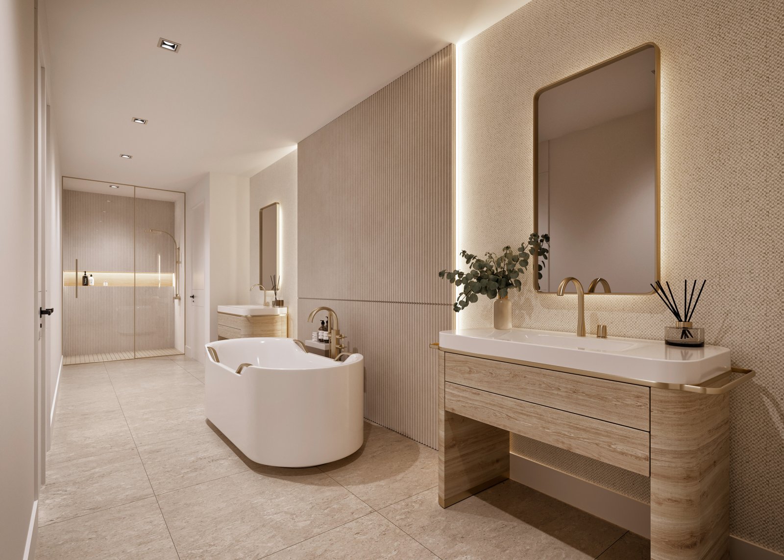 Armani bathroom collection: frameless rain shower and designer soaking tubs