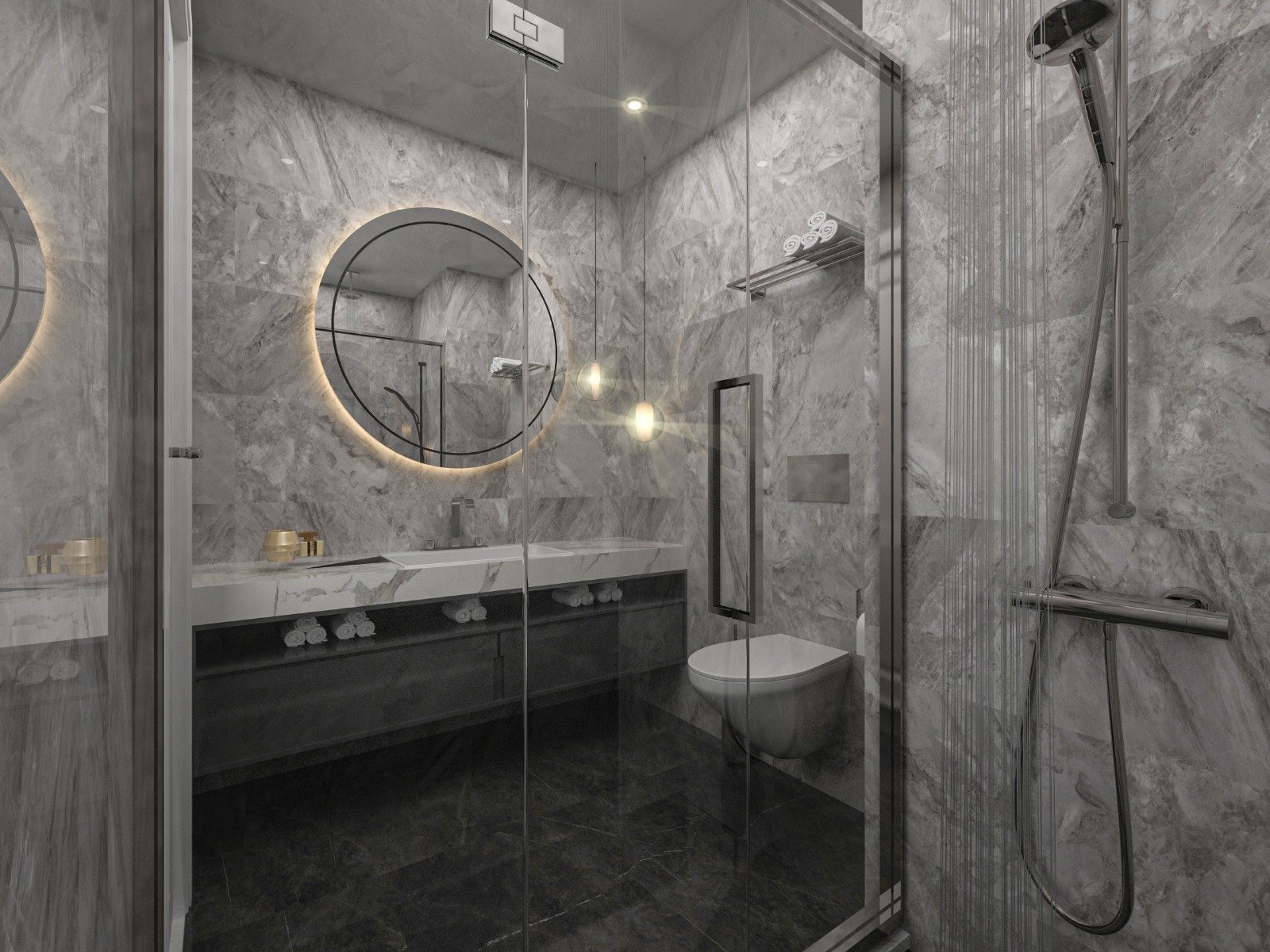Modern shower cabins and toilets