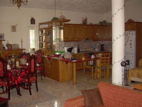 Das grosszuegige Haus mit offenem Wohnbereich ist gebaut auf einem Grundstueck von 2.000 qm. Es besteht eine weitere Baugenehmigung fuer das Haupthaus (700 qm) sowie 600 qm fuer das kleinere Apartment. Das Apartment ist durch eine Tuer mit dem Haupthaus verbunden und koennte eine schoene Gaestewohnung sein, vermietet werden oder einfach das Haupthaus um ein weiteres Zimmer vergroessern. Das Objekt kann zusammen erworben werden oder Haus und Apartment getrennt. Der Kaufpreis betraegt 350.000 Euro, bzw getrennt: 280.000 Euro fuer das Haus und 110.000 fuer das Apartment. Das Haupthaus verfuegt ueber einen offenen Wohnbereich mit grosser Einbaukueche, Essbereich und Wohnzimmer mit offenem Kamin. Rohre fuer eine zukuenftige Zentralheizung wurden bereits verlegt. Es gibt 3 Schlafzimmer und 1 Badezimmer mit Wc, Bidet und grosser Badewanne. Die Fussboeden des Hauses sind komplett gefliesst. Im grosszuegigen Garten steht eine Abstellkammer mit 30 qm Grundflaeche. Der schoene Ausblick geht ueber die ganze Messara Ebene und die Stadt Mires die nur 4 km entfernt liegt. Das Apartment ist 45 qm gross und liegt auf 2 Ebenen. Im Erdgeschoss befindet sich die kleine aber sehr gut ausgestattete Kueche, eine Badezimmer mit Dusche und ein Wohn- oder Esszimmer. Ueber eine Holztreppe gelangt man ins Schlafzimmer mit Doppelbett. Zu dem Apartment gehoert ein Garten von 1000 qm. -
