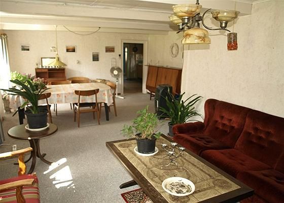 Indeholder: * Baggang med faste skabe, elvandvarmer samt opgang til uudnyttet 1. sal * Lille værelse * Lille badeværelse med stiftmosaik på gulv * Gl. køkken med spiseplads og brændeovn * Spisekammer * Soveværelse * Stue med udgang til terrasse * Entre * Lille værelse.