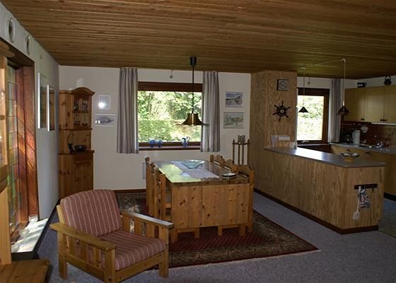 Sommerhuset er indrettet med stor lyd stue med brændeovn og udgang til stor overdækket terrasse. Stuen er i åben forbindelse med spiseafdeling og dejligt køkken i lys eg. Pænt badeværelse med håndvask og seperat toilet. 2 gode værelser, det ene med køjer og begge med skab. Stort soveværelse med skabe.