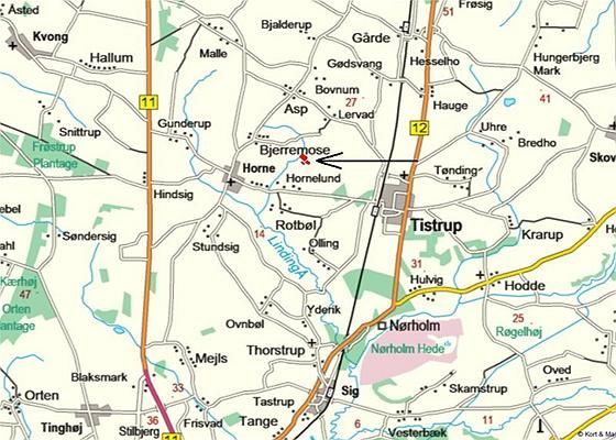 Fritidslandbrug beliggende i Bjerremose, nordøst for Horne i et naturskønt område for enden af fælles privat grusvej.