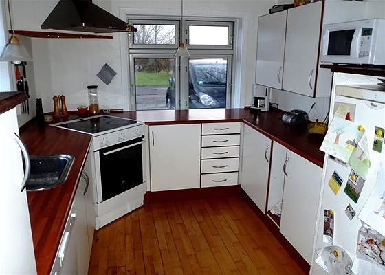 Huset indeholder entre med klinkegulv, oliefyr, tr...