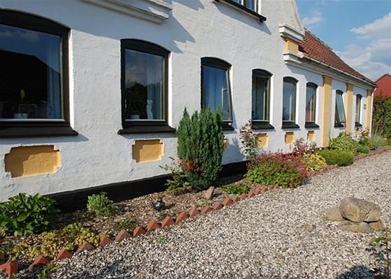 Hvor der tidligere lå produktionsbygninger er der nu lavet have med en mindre fiskedam og hyggekroge, så der altid kan findes læ i haven eller på den pæne gårdsplads.