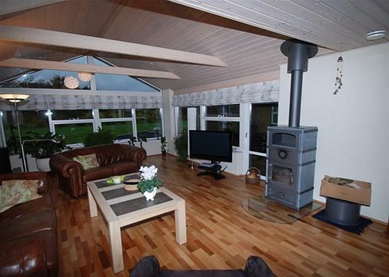 Stort, velholdt stuehus om- og tilbygget i 2005. Huset er opført i gul tegl med eternittag. Der er ved inddragelse af 1. salen monteret en lille altan, der byder på en st...