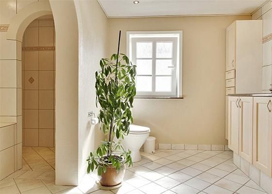 Fra entreen flere muligheder. Til ventre direkte indgang til et stort køkken med spiseplads eller til højre indgang til soveværelse og lige frem indgang til stort, lyst badeværelse med både bruseniche og karbad.