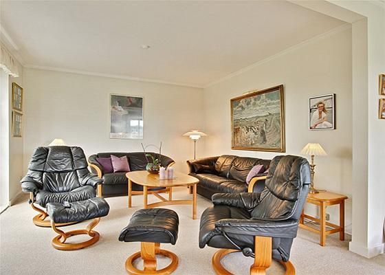 Fra køkkenalrummet adgang til entre og videre til en stor stue - ligeledes med flot udsigt over haven og direkte udgang til terrasser. Fra entre er der indgang til kontor/værelse med faste skabe, til badeværelse og opgang til 1. sal samt nedgang til kælder.
