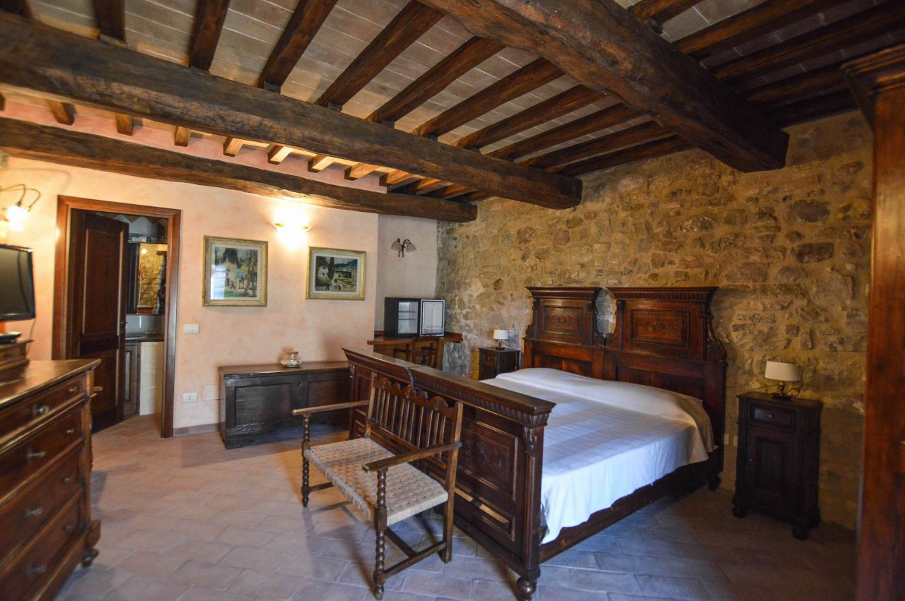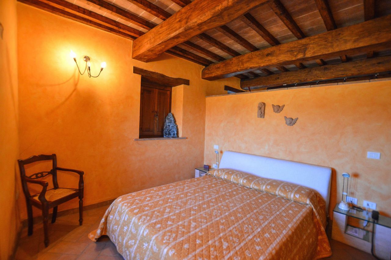 The real plus of these floors is the master bedroom, which is a proper suite with huge step-in closet, en-suite bathroom with Jacuzzi and sauna. From the master bedroom, via a few steps, you can reach the spacious and luminous 60 sq.m. studio and as you step into, you are surrounded by the good scent of the juniper floor. This is the perfect, private retreat where you can work, study or just read a good book in front of the fireplace. It is from the studio, that you have access to the Turret, that was used in the past to control the valleys around Todi.