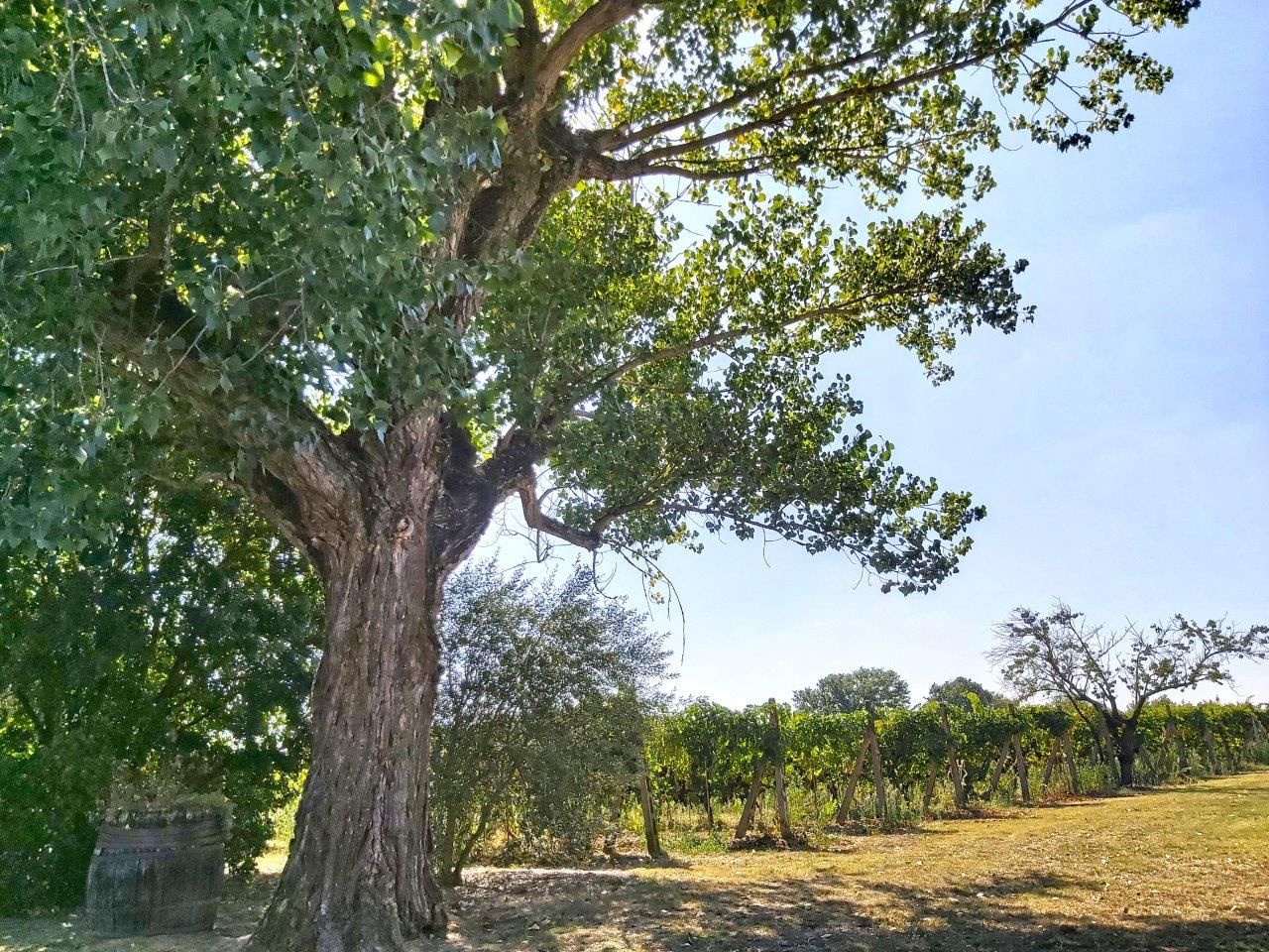 Divided by a wooden fence, in front of the house there is a large fenced land with tall trees including oaks, currently used as a paddock for horses.