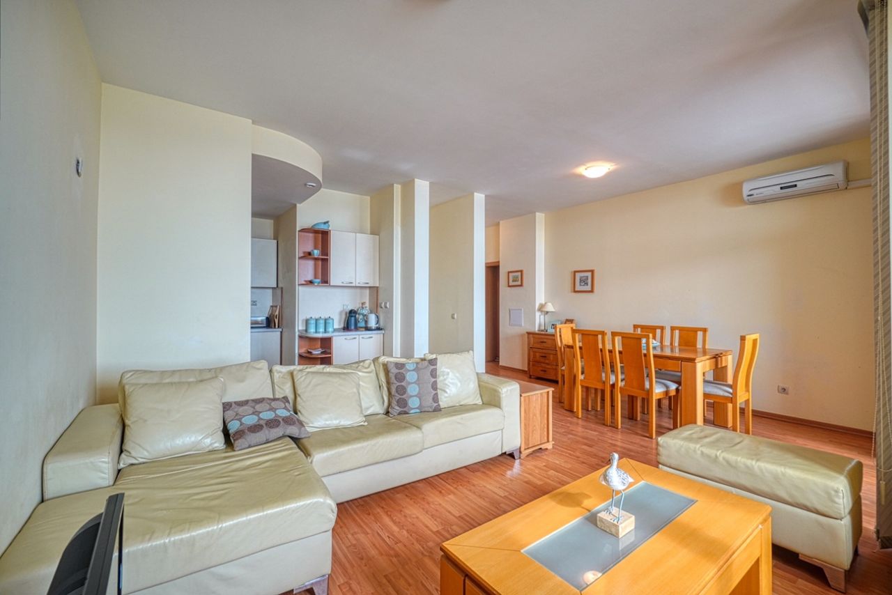 Maisonette Wohnung mit zwei Schlafzimmern. Es gibt ein geräumiges Wohnzimmer mit Küche, Terrasse und WC auf dem Boden und im Erdgeschoss befinden sich zwei Schlafzimmer mit angrenzenden Badezimmern und eine Terrasse zu einem Schlafzimmer. Die Fläche der Wohnung beträgt 130qm. Die jährliche Wartungsgebühr beträgt 1050 €, unabhängig von der Fläche der Immobilie. Die Immobilie steht mit den Möbeln zum Verkauf.