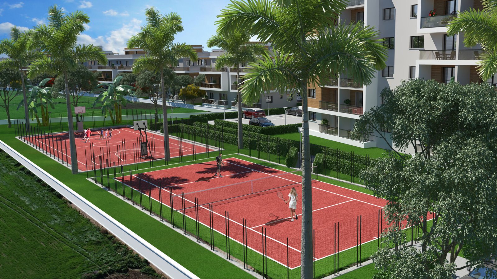 Für die sportbegeisterten Bewohner bieten der Tennis- und Basketballplatz eine hervorragende Möglichkeit, dem Alltag zu entfliehen. Die Anlage stellt außerdem großzügige Parkmöglichkeiten für alle Bewohner bereit.