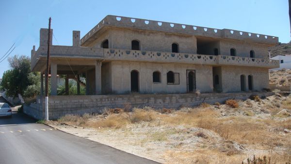 Kalamaki Strand, Süden Kretas. Halbfertiges 2-geschossiges Hotelgebaude, nur wenige Meter vom Meer entfernt.