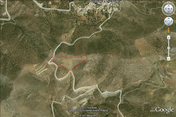Das grosse Grundstück ist ca. 2Km vom Dorf Antiskari entfernt, zwischen den Stranden von Kali Limenes und Lendas im Süden Kretas. Es gibt eine Wasseranschluss, aber keinen Strom. Die Zufahrt führt von der Hauptstrasse über einen 300 Meter langen Feldweg.