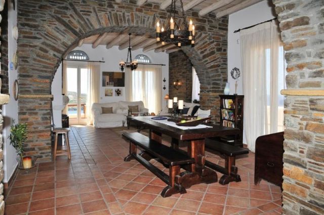 Eine wunderschöne Stein Villa auf der Kykladischen Insel Andros vor dem Strand mit 370 qm Wohnfläche auf 3 Etagen und 4000 qm Grundstücks Fläche . Erdgeschoss : 1 Schlafzimmer ,Küche ,Wohnzimmer Kamin ,Bad. 1stock: 3 Schlafzimmer die 2 Schlafzimmer haben Kamin, 2 Badezimmer. Auf dem Garten ist der Schwimmbecken 12* 5,5 und eine Pergola mit Sitzecke der ganze Garten hat automatische Bewässrung Anlage. Es gibt eine Treppe die zum Strand herunter geht. Andros hat ein Hubschrauberlandeplatz. Athen ist von Andros 2 stunde entfernt mit dem Schiff und Mykonos 2,5 Stunden entfernt. Der Preis der Steinvilla ist von 2.500.000 euro auf 1.200.000 Euro