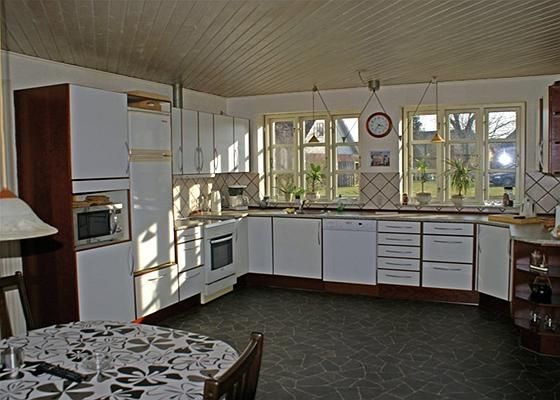 Boligen er indrettet med stor entre med flot klinkegulv og stort skydedørsskab. Lækkert stort lyst køkken/allrum med mange hvide skabe med mahognikanter og plads til stort spisebord. Fra køkkenet er der udgang til terrasse og have og franske døre giver adgang til stor lys stue med laminatgulv.