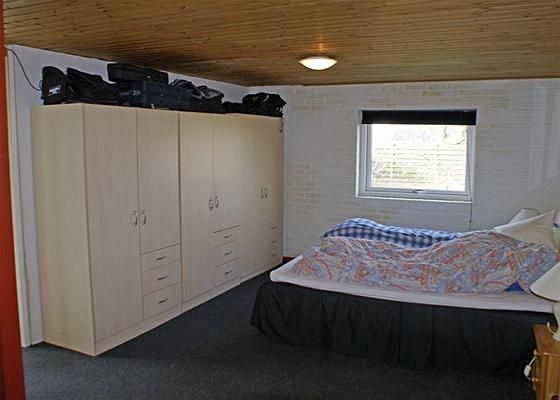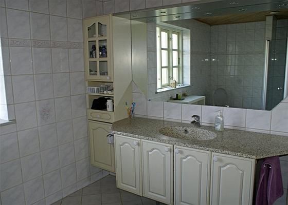 Flot badeværelse med lyse fliser, pænt skabsmiljø og stor bruseniche. Mellemgang fører til stort værelse med trappe til 1.sal som er forberedt til inretning af værelser, idet der er nye spær og undertag. Soveværelse. Bryggers med skabe og vaskemaskine. Stort værelse og toilet med håndvask. Fra bryggerset er der direkte adgang til det store lyse værksted, som kan anvendes til mange formål. Der er mulighed for opvarmning i værkstedet med en brændeovn, men denne må naturligvis kun anvendes, når der ikke er biler i værkstedet.