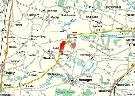 Slagtesvineejendom beliggende ca. 12 km vest for Grindsted og ca. 5 km nord for Ansager.