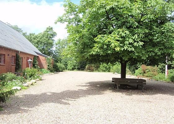 Gårdspladsen er grusbelagt og omgivet af træer. Syd for stuehuset er der dejlig have, åben med god udsigt over mark og søer ...