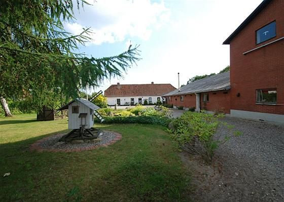 Hvor der tidligere lå produktionsbygninger er der nu lavet have med en mindre fiskedam og hyggekroge, så der altid kan findes læ i haven eller på den pæne gårdsplads.