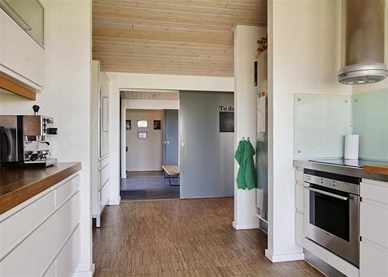 Det centrale rum er det lyse åbne rum med Morsø brændeovn og spiseplads i direkte tilknytning til køkkenafsnit. Her kan døren slåes op til den store terrasse.