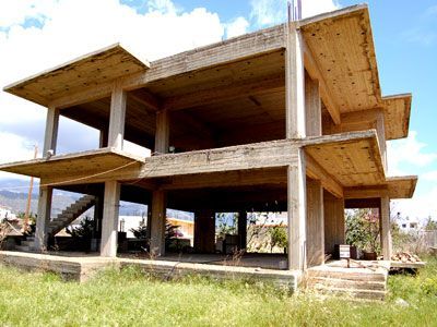 Kokkinos Pyrgos: grosses Grundstueck mit 1) neues Haus, 120 qm, 2 Schlafzimmer und 2) 2 geschoessiges Bauskelett, Zementfundament, 140 qm pro Stockwerk.