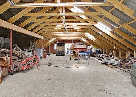Stalden er indrettet med 6 hestebokse, saddelrum samt plads til oplag af foder. Herudover stort værksted med plant gulv samt aut. port, lade samt stor garage.