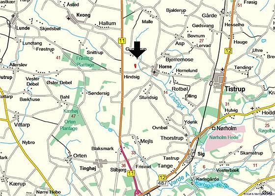 Hesteejendom beliggende vest for Horne med kort afstand til Hovedvej A11. Der er tilkørsel til ejendommen fra offentlig grusvej via privat grusvej.