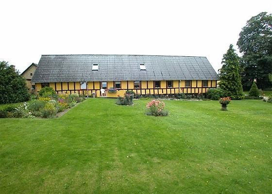 Stuehuset fremtræder i bindingsværksmurer med eternittag.