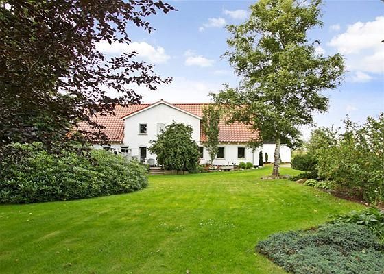 Til ejendommen er der et hvidmalet stuehus med røde glaseret tegl. S...
