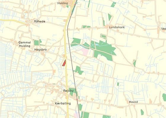 Regulært stykke landbrugsjord, beliggende mellem Hviding og Rejsby. Der er adgang til marken fra Ribevej.