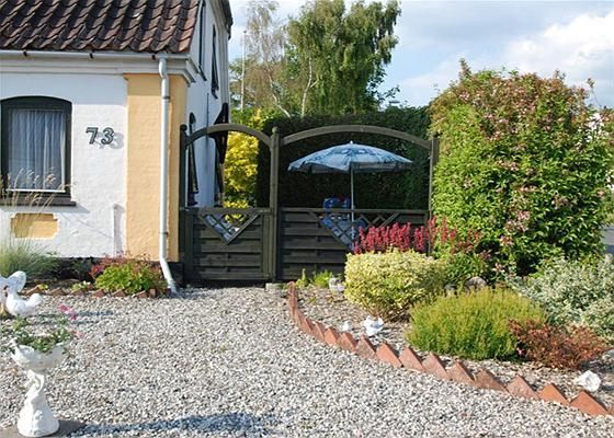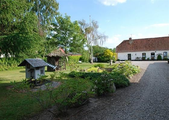 Hvor der tidligere lå produktionsbygninger er der nu lavet have med en mindre fiskedam og hyggekroge, så der altid kan findes læ i haven eller på den pæne gårdsplads.