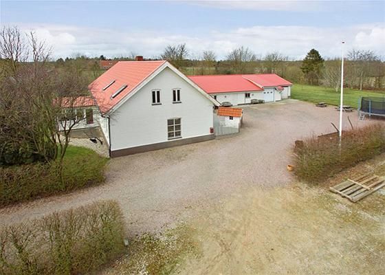 Herudover 220 kvm stald med bl.a. 3 små bokse til hunde, garage med betongulv, stort værksted samt disp. rum med port.