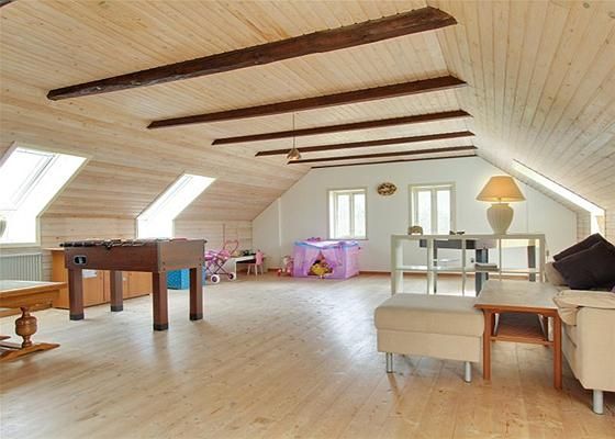 1. sal med stor stue/disponibelt rum med synlige bjælker og trægulv mm