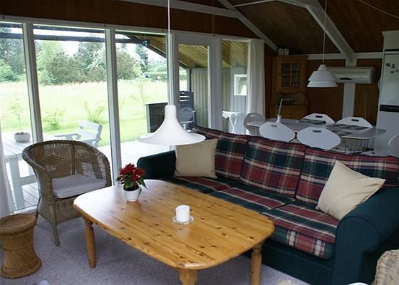Det helt centrale rum i sommerhuset er stuen, som også er i åben forbindelse med pænt køkken med lyse skabe. Stuen har loft til kip med fritlagte bjælker og fra et ...