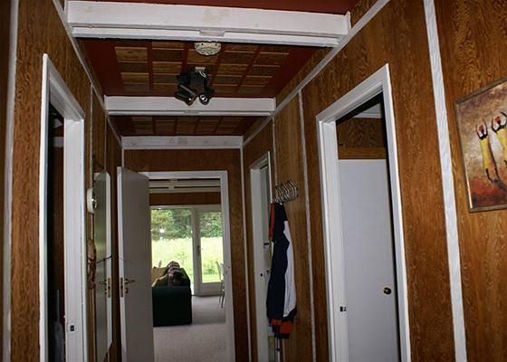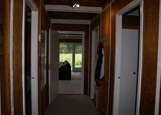Pænt lyst badeværelse med bruseniche. Soveværelse og værelse med skabe.