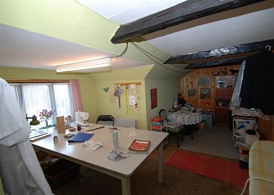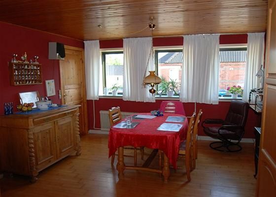 På 1. sal findes 2 værelser med synlige bjælker og en stor stue.