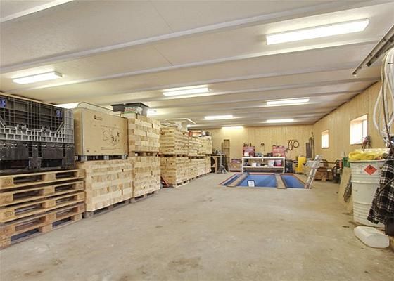 Isoleret driftsbygning med port og stort rum til lager. Dertil værkstedsrum med hylder samt mulighed for tilkobling af varme.
