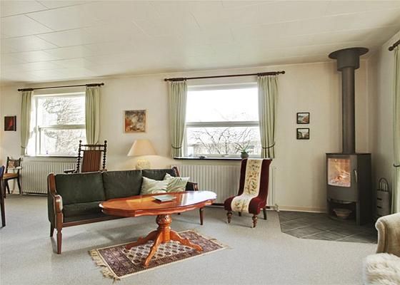 Den store stue med udgang til lukket terrasse har installeret konvektionsbrændeovn som supplement til oliefyret.