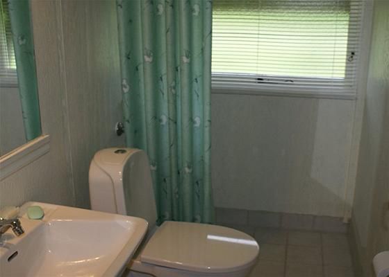 Pænt lyst badeværelse med bruseniche. Soveværelse og værelse med skabe.