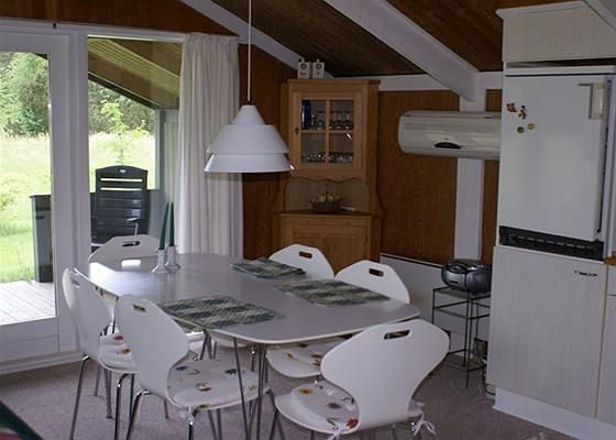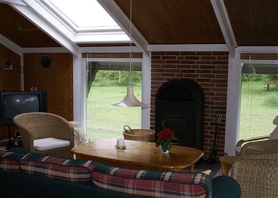Det helt centrale rum i sommerhuset er stuen, som også er i åben forbindelse med pænt køkken med lyse skabe. Stuen har loft til kip med fritlagte bjælker og fra et ...