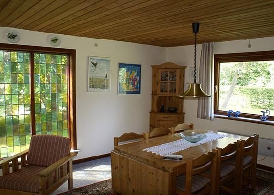 Sommerhuset har pæne trælofter og glaslvæv på væggene og stor i stuen er der store vinduer mod syd og vest.