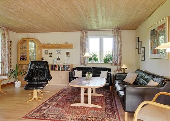 Der til køkken og opholdsstue i et med spiseplads og sofaafsnit. Fra spiseafdelingen som fra stuen direkte udgang til overdækket terrasse og den velholdte have.