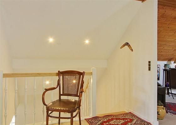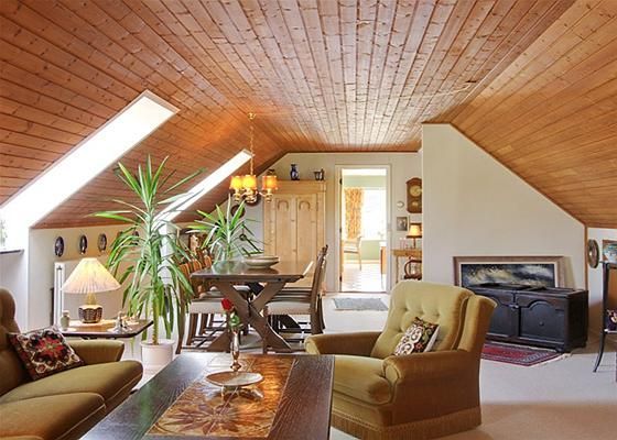 1. salen er fuldt udnyttet med en stor stue og et stort værelse med pejs/brændeovn, der har været anvendt til kontor. Fra stuen udgang til svalegang og udsigt over haven.