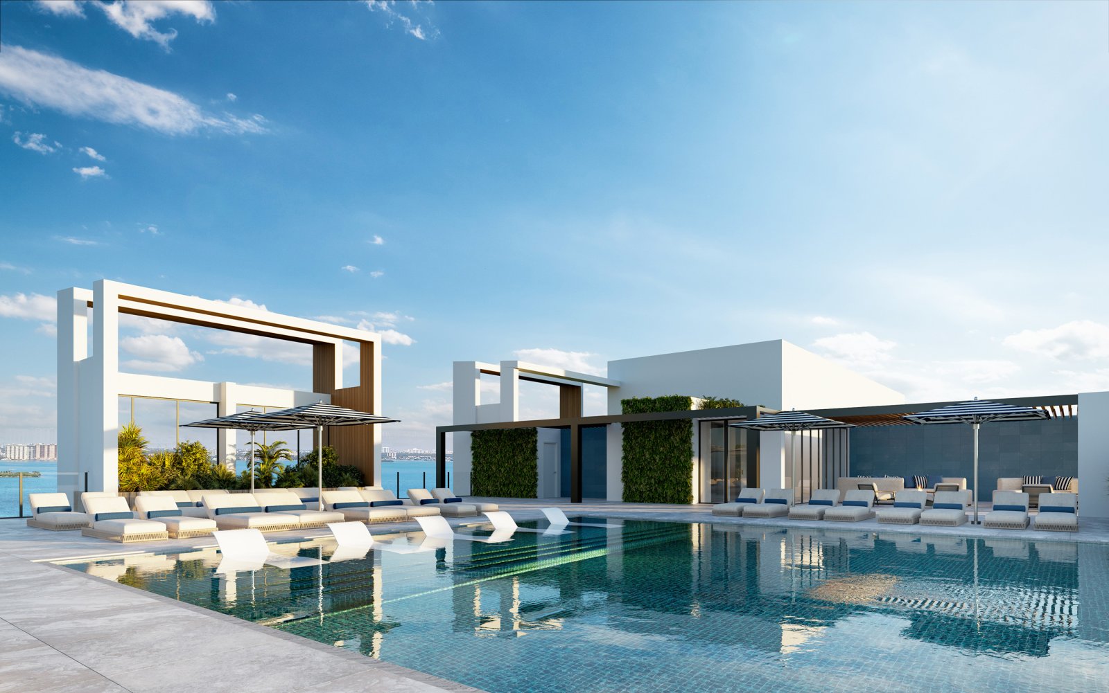 Expansive rooftop pool deck with heated pool, luxury cabanas, outdoor showers, and summer kitchen with waterfront views
