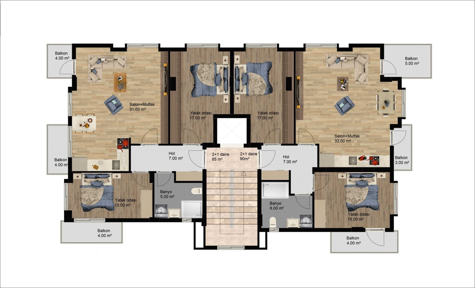 Located in the heart of Alanya, this spacious 2+1 apartment on the 2nd floor of a 4-story building is only 600 meters from the sea. With its south, west, and north-facing aspects, this apartment offers a modern living experience for both investors and those seeking a comfortable home.