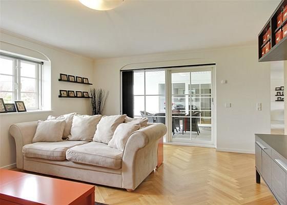 Stilen og materialevalget er gennemført og konsekvent med ens klinker, ens inventar i køkken og badeværelser, flotte egetræsgulve lagt som sildebensparket, granitbordplader, lyse og indbydende rum, opdeling i forældre- og børneafdeling, energi- og allergivenligt, kort sagt - et sted hvor der bare er tænkt over tingene.