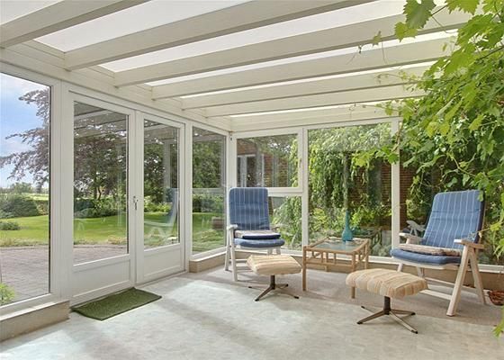 Nyere udestue med plasttermovinduer og plasttag. En side er med mur i røde sten.