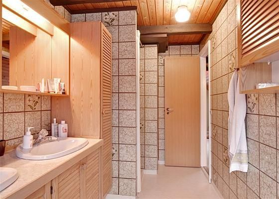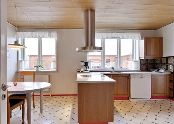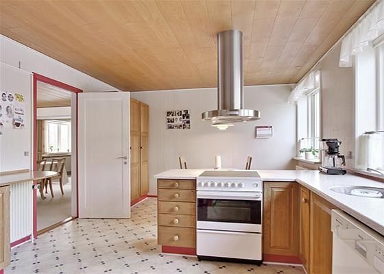 Indeholder bl.a.: Entre med garderobe , Værelse, Køkken med spiseplads, 2 stuer med foldedør imellem, Toilet med fliser til loft mm. 1. sal med badeværelse, 2 værelser, 1 gavlværelse samt soveværelse - alle med faste skabe.