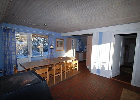 Det oprindelige hus er indrettet med lille gang med ny dør til terrassen og adgang til mindre badeværelse med brus, trappe til 1. sal - der indeholder 2 gode værelser, det ene med udgang til svalegang. Desuden køkken/alrum i åben forbindelse med mindre opholds-/hygge-afdeling, her er den ene af husets 2 brændeovne placeret centralt i det åbne rum.