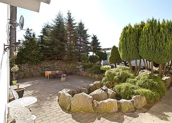 Den lukkede gårdsplads og sydvendte terrasse betyder mange små oaser med læ og sol i pagt med de skønne omgivelser ved bygningerne og haven.